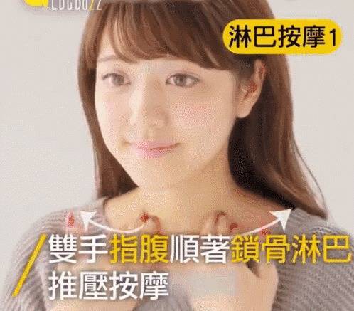 1、用双手在锁骨的位置进行推压和按摩,这样可以很好的促进我们的淋巴排毒,同时还能很有效的缓解我们的肩颈疲劳等问题。